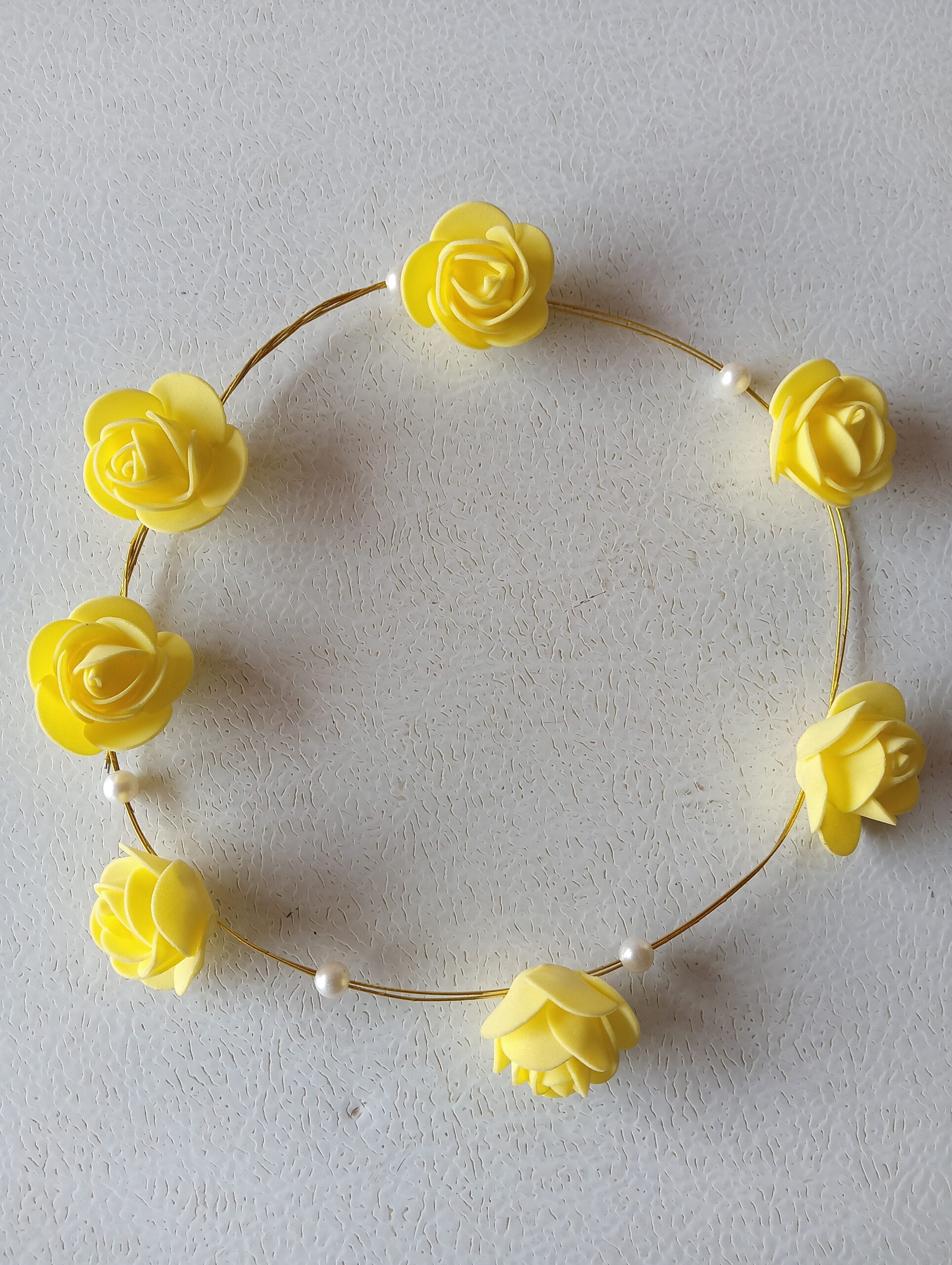 The Yellow Rose Flower Headband is a beautifully handcrafted accessory designed to add a touch of charm and elegance to any look. Featuring delicate yellow foam roses arranged on a flexible golden band, this headpiece exudes freshness and grace. Small pearl accents between the flowers enhance its sophisticated appeal, making it perfect for festive occasions, photoshoots, weddings, or casual wear.